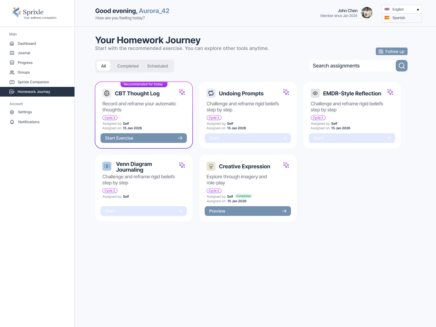 Sprixle is a modern, production-focused web platform designed for therapy and wellness workflows. It supports multiple user roles (client, therapist, admin), secure authentication with two-factor verification, and guided onboarding/intake flows to ensure users complete required setup before accessing core features. The platform includes structured API design with validation and consistent response handling, subscription-aware feature access, and robust observability using Sentry. On the product side, the system supports therapist-client interactions through features such as referrals, homework management, journaling intent tracking, session pre-check-in workflows, and role-specific dashboards. The architecture emphasizes scalability, maintainability, and real-world SaaS patterns including auth, billing, gated features, server/client data separation, and error monitoring.