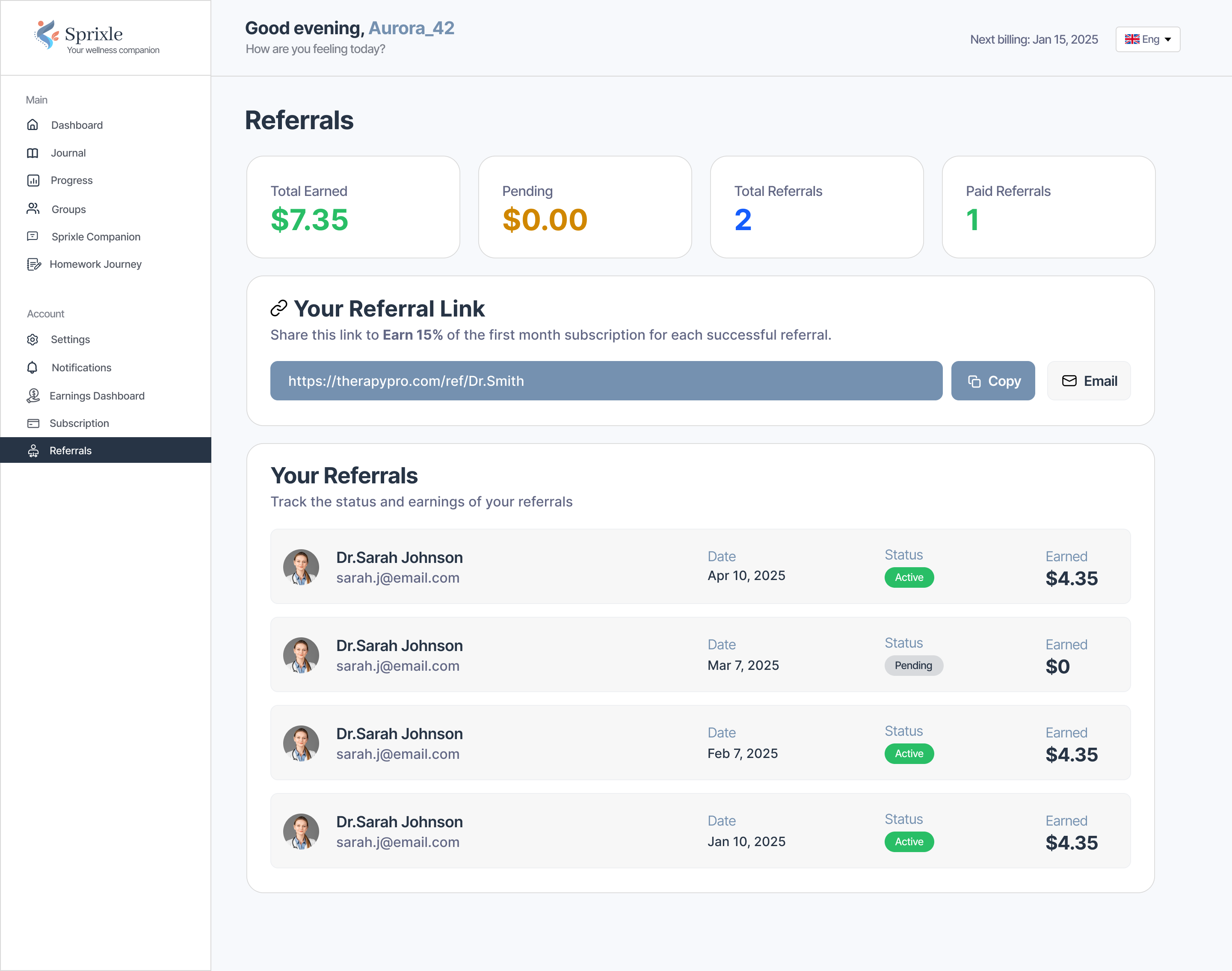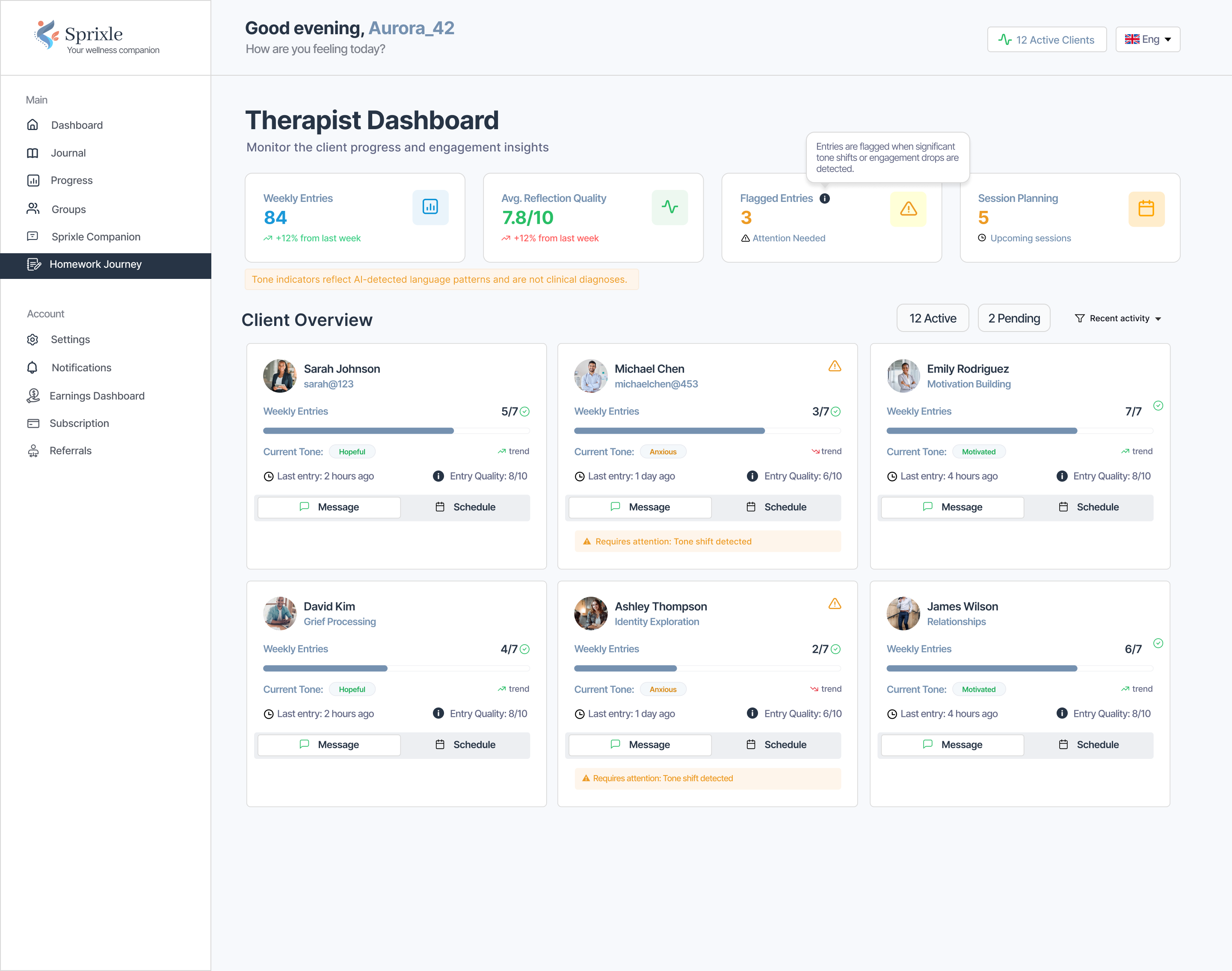 - Domain features: referrals, homework system, journaling intent tracking, session pre-check-in