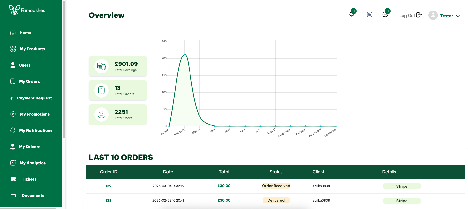 Famooshed is a Laravel-based marketplace platform built for local commerce. It combines a customer-facing storefront, a merchant/admin management panel, and API layers for customer, driver, and owner workflows. The system supports merchant onboarding, product and category management, cart and checkout flows, order lifecycle tracking, driver assignment, support ticketing, wallet operations, subscriptions, and payment processing. Its structure shows a multi-role architecture designed to serve customers, merchants, drivers, and platform administrators from a shared operational backend.